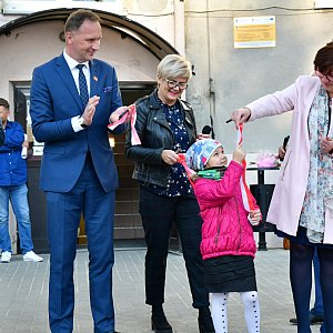 Symboliczną wstęgę przecinali: uczennica SP5 z klasy I, Naczelnik Wydziału Edukacji Sławomira Gajewska, wnioskodawca projektu Wojciech Gajdus, Dyrektor SP5 Jolanta Tarniowa, przedstawiciel wykonawcy Marcin Drewek oraz przyjaciel szkoły Zenon Różycki.
