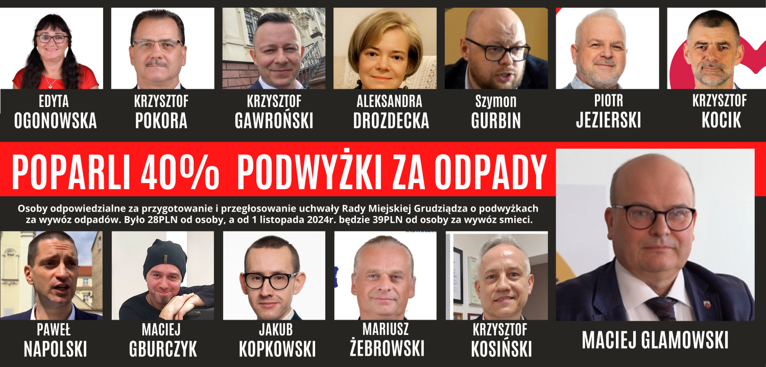Warto przypomnieć, że za kadencji Macieja Glamowskiego odbiór odpadów podrożał o 100%. Brakuje działań uszczelniających system. Wielu mieszkańców, mimo że zamieszkuje w Grudziądzu, nie jest uwzględnionych w deklaracjach "śmieciowych". Szacuje się, że jest ich nawet 10 tysięcy.