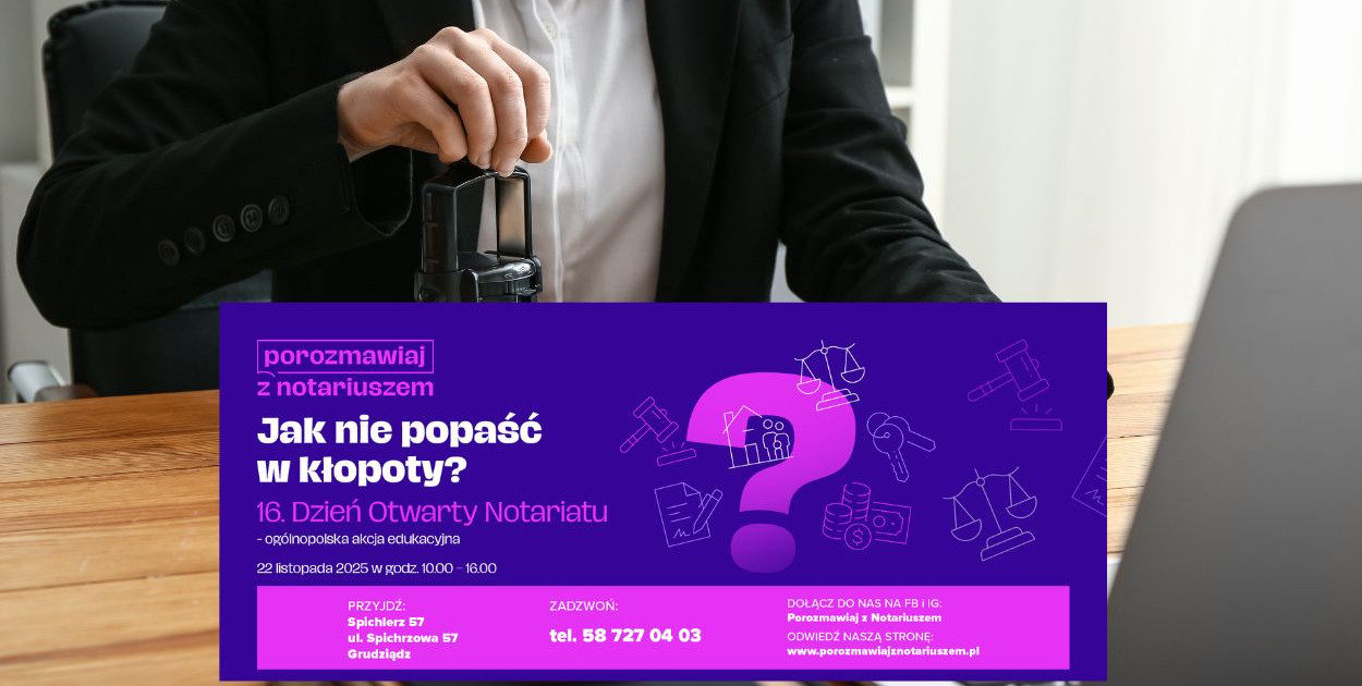 Już w najbliższą sobotę, 22 listopada 2025 r., mieszkańcy Grudziądza będą mieli wyjątkową okazję do skorzystania z bezpłatnych informacji prawnych. W ramach 16. edycji ogólnopolskiej akcji edukacyjnej „Dzień Otwarty Notariatu” notariusze będą dyżurować osobiście, a także telefonicznie i online. Tegoroczna akcja odbywa się pod hasłem: „Jak nie popaść w kłopoty? Porozmawiaj o tym z notariuszem”.
