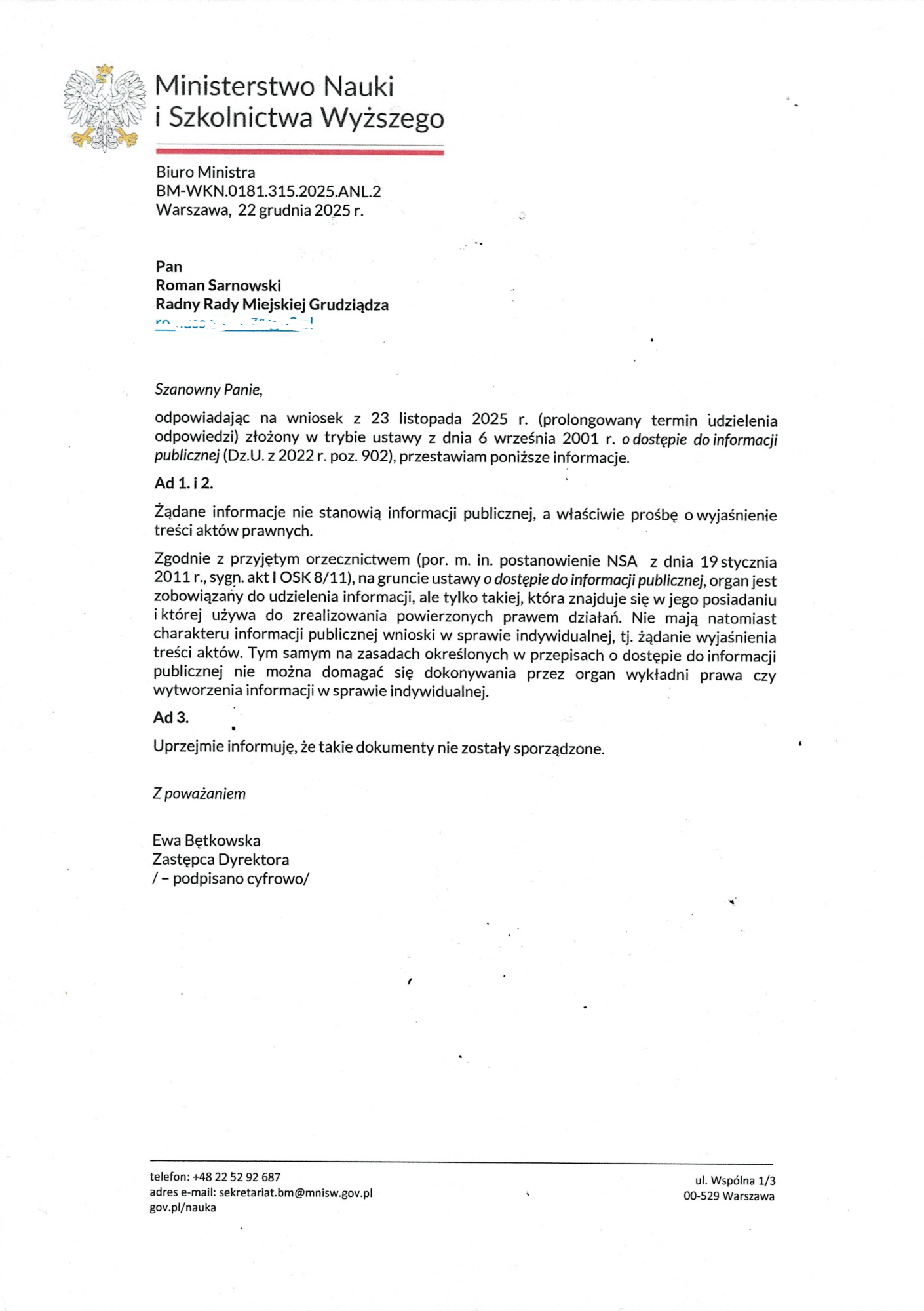Radny Sarnowski powiedział „sprawdzam” i zapytał Ministerstwo o ten dokument (pismo do ministerstwa). Odpowiedź resortu z 22 grudnia 2025 r. jest krótka i brutalna:
