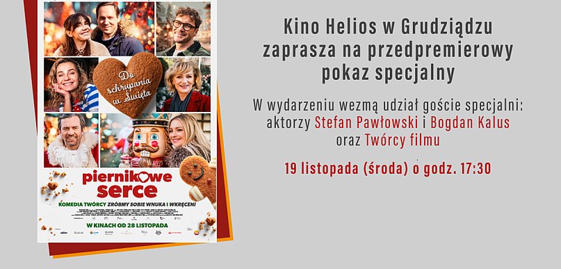 Świąteczny klimat, znakomita obsada i spotkanie z wyjątkowymi gośćmi – tak zapowiada się przedpremierowy seans filmu „Piernikowe serce”, który odbędzie się w środę, 19 listopada o godzinie 17:30 w kinie Helios w Grudziądzu. Wydarzenie uświetni obecność aktorów – Stefana Pawłowskiego i Bogdana Kalusa, jak również twórców tytułu.